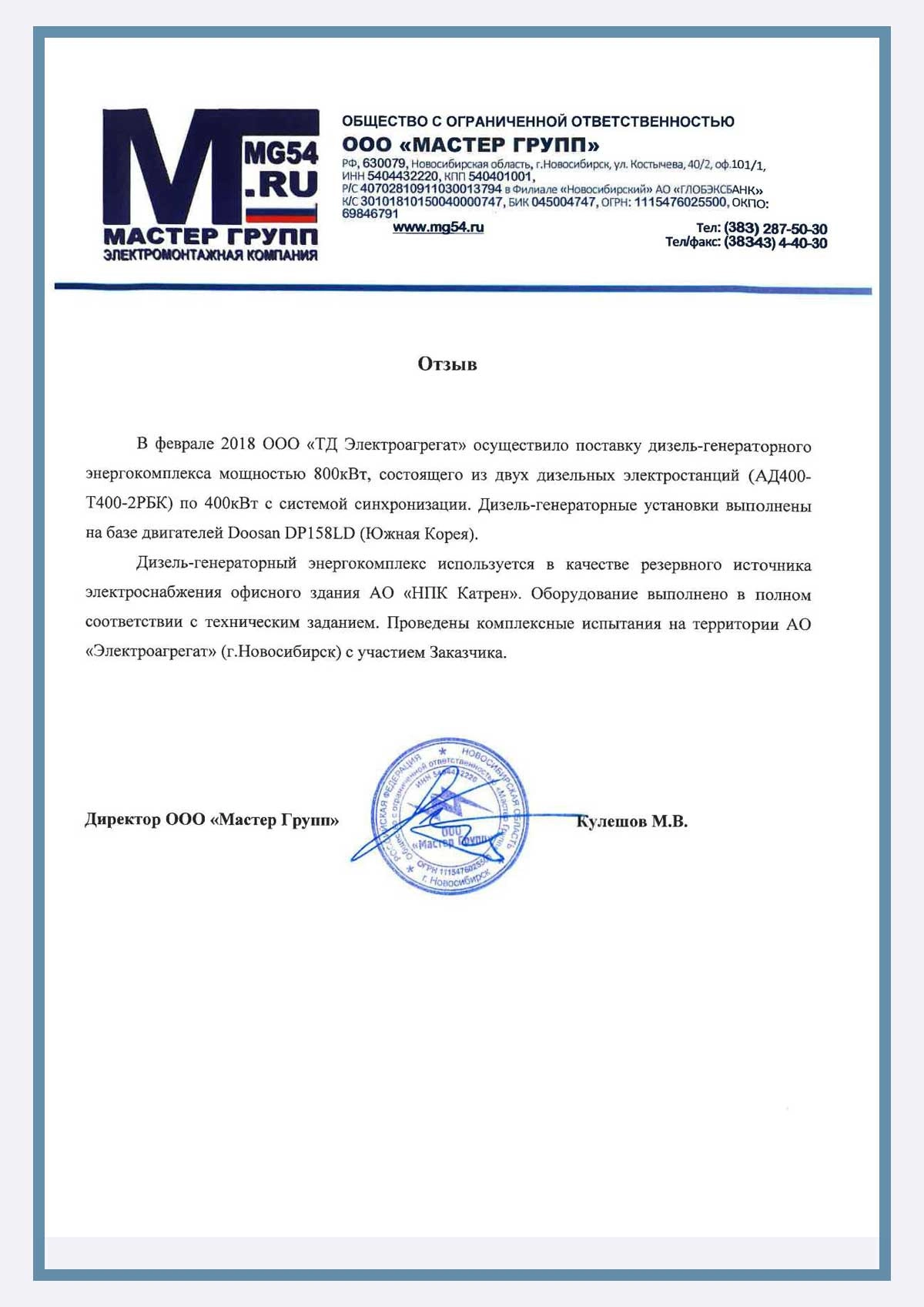 Отзыв контрагентов о компании ООО «ТД Электроагрегат» и  исполненном проекте для ООО "МАСТЕР ГРУПП" г. Новосибирск